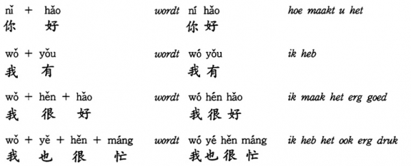 De vier tonen zijn de belangrijkste karakteristiek van de Chinese spreektaal. Je weet al, dat je de tonen correct moet 'zingen' om verstaan te kunnen worden. Derhalve moet meteen in deze les al een opmerking gemaakt worden over de tonen. Als meer 3de tonen op elkaar volgen, behoudt alleen de laatste lettergreep zijn eigen toon. De daaraan voorafgaande lettergrepen verliezen hun 3de toon. Zij krijgen dan de 2de toon. Bijvoorbeeld:
